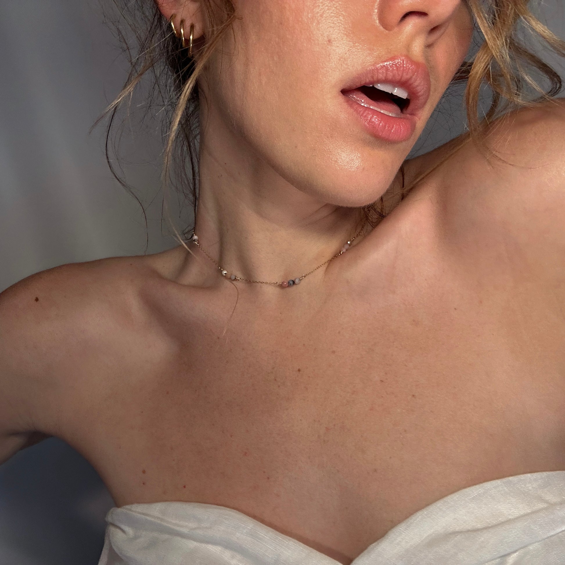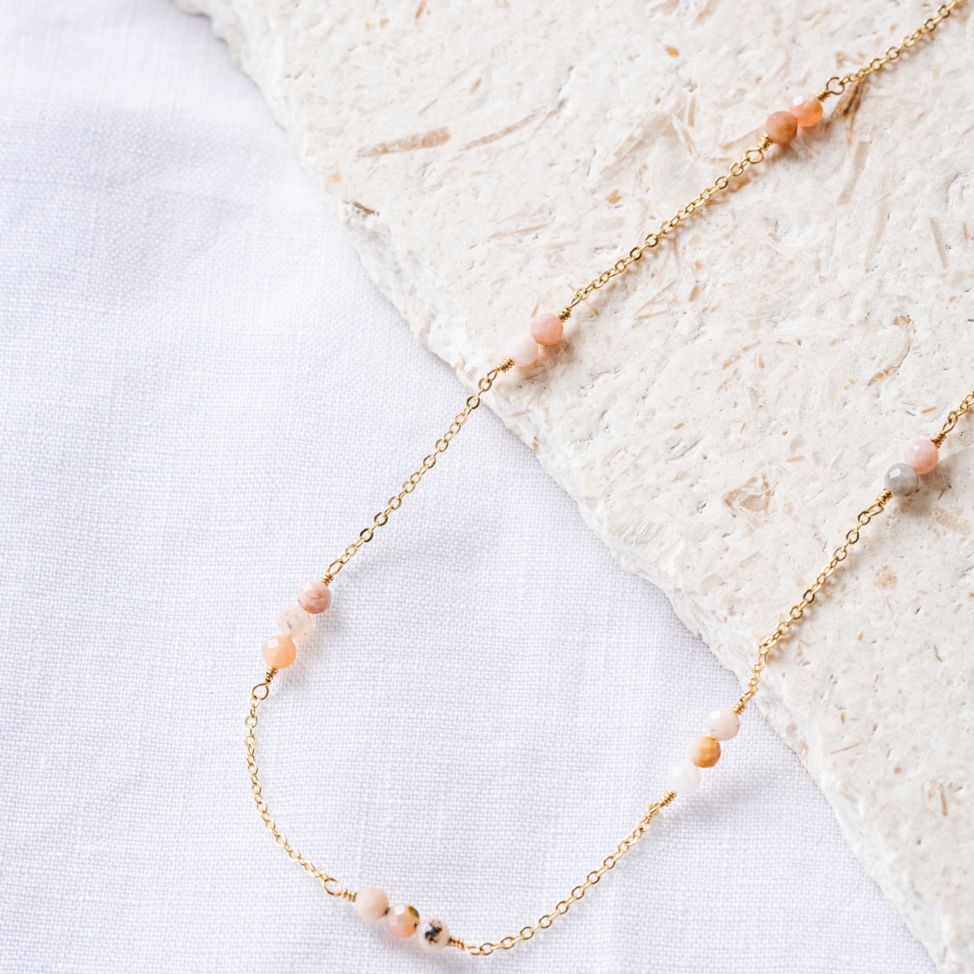 32cm gold plated chain, 8cm extension chain with pink opal beads.